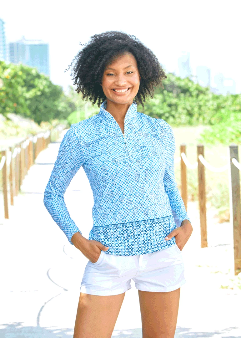 With the perfect combo of sporty and stylish, this will be your new go-to top! The Sport Zip Polo feels great, looks fabulous and goes everywhere you do, including the water. Long sleeve, lightweight and breathable, this top is made from luxurious sport knit fabric, and offers UPF 50+ in every stitch. Wear it as a rashguard at the beach or to brunch as a cute top. Pair with our White Microfiber Swim Shorts, White Classic Swim Skirt, White Longer Swim Skirt or White Side Tie Swim Skirt.