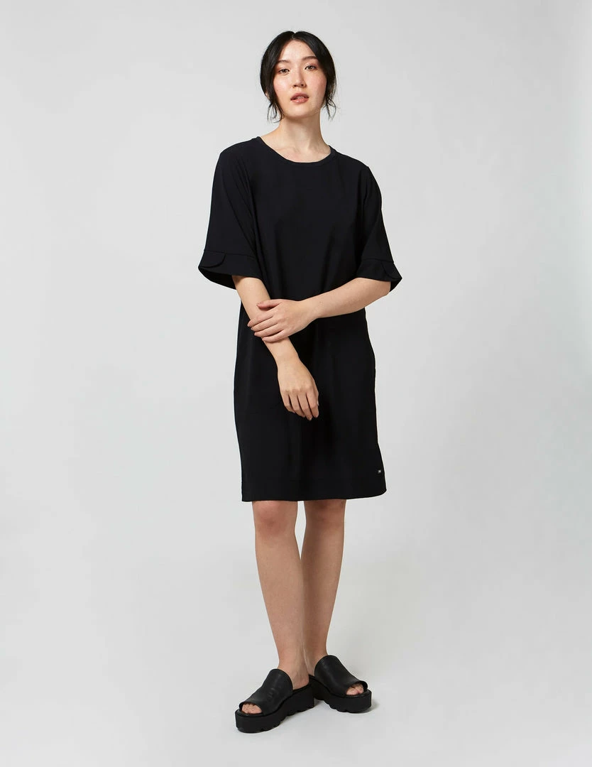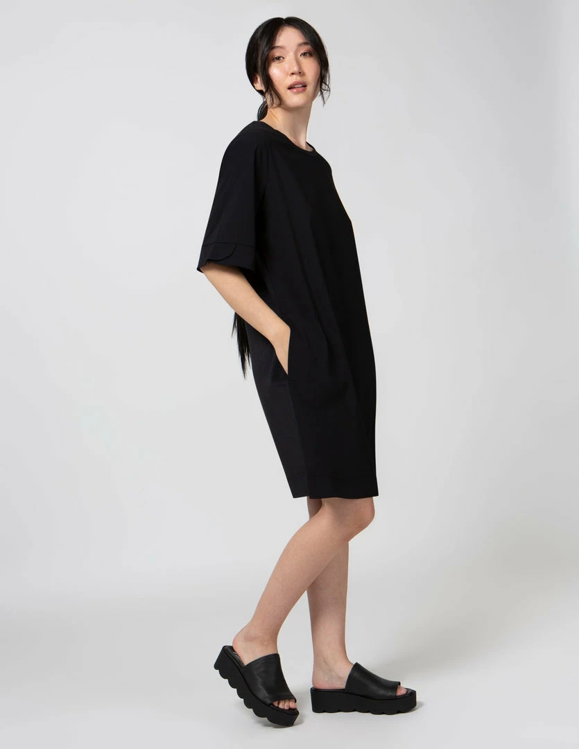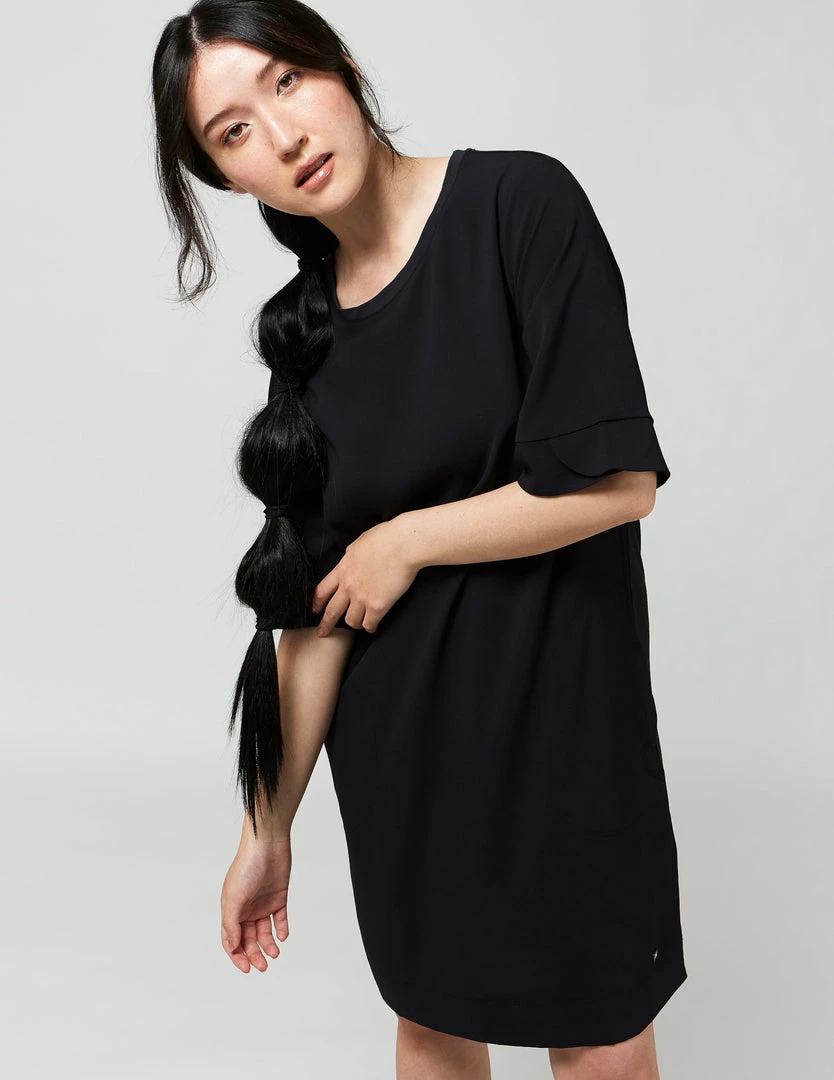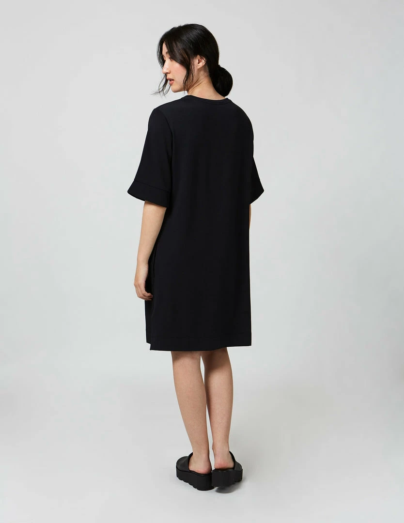 The Arkley Dress, an elbow sleeve dress with round neckline made with TENCEL™ Modal, sourced from sustainable beech wood and produced in an environmentally responsible pulp to fiber process, and with Möbius LT, made with recycled polyester, created by using post-consumer plastic bottles. Above the knee length dress with Möbius LT fabric at front panel and sleeves, TENCEL™ Modal fabric at back, side-seam pockets and side slits.