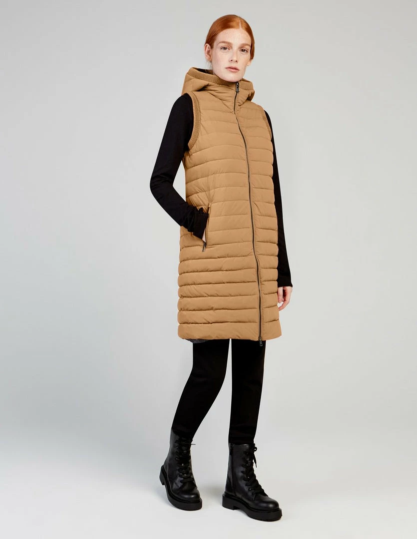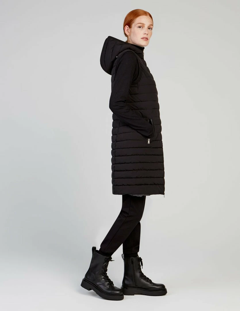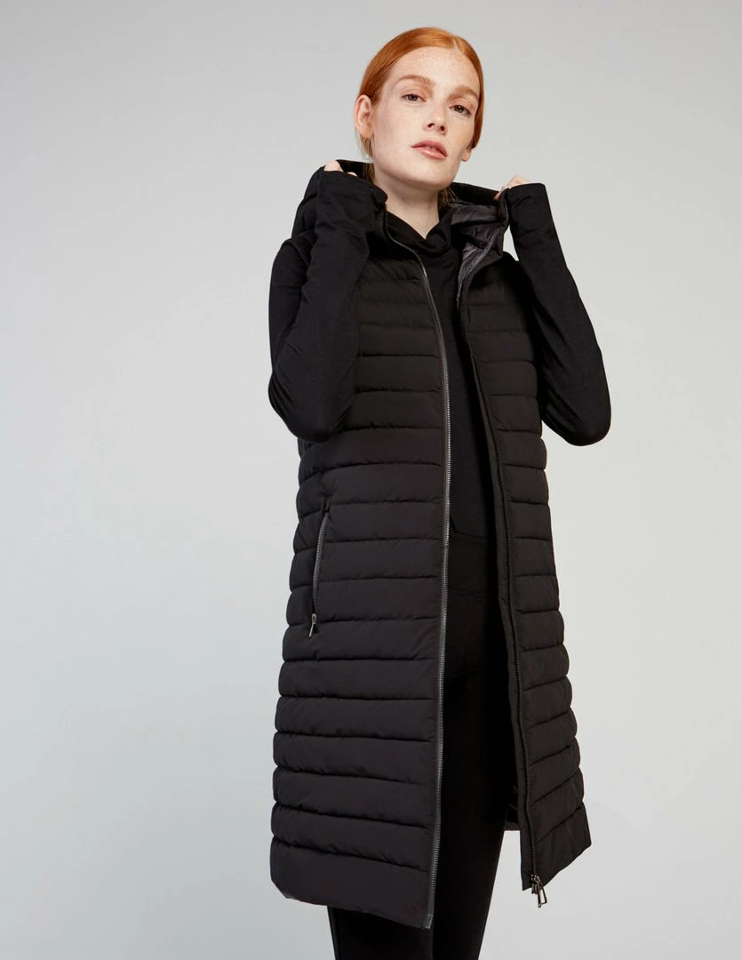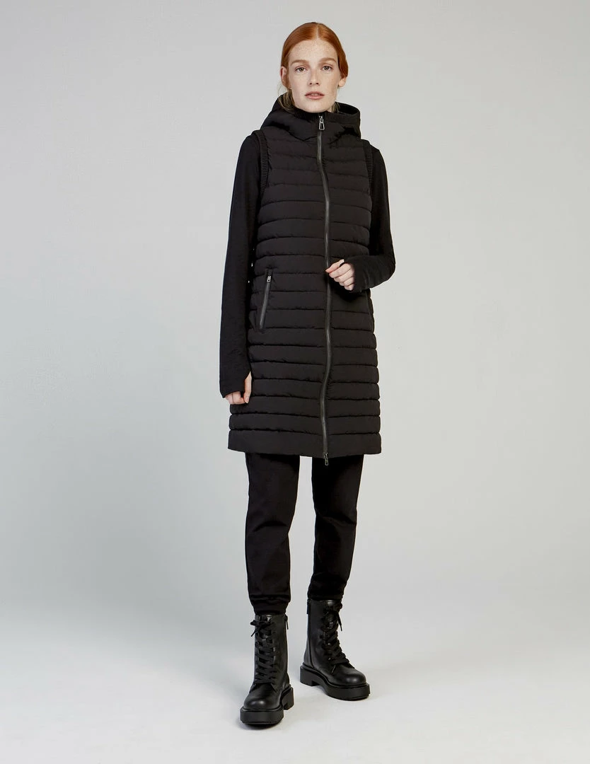 Winter vest with two way METALUXE® YKK® zipper at center front made with Repreve® certified recycled polyester, which is made from post-consumer plastic bottles, and with Sorona®, which is made from plant-based materials. Vest with zip secure pockets with METALUXE® YKK® zippers, two easy access internal pockets, back neck and sleeve hidden snaps for stealth connection with outerwear, and cuffs and hood edge in quilt stitch rib.