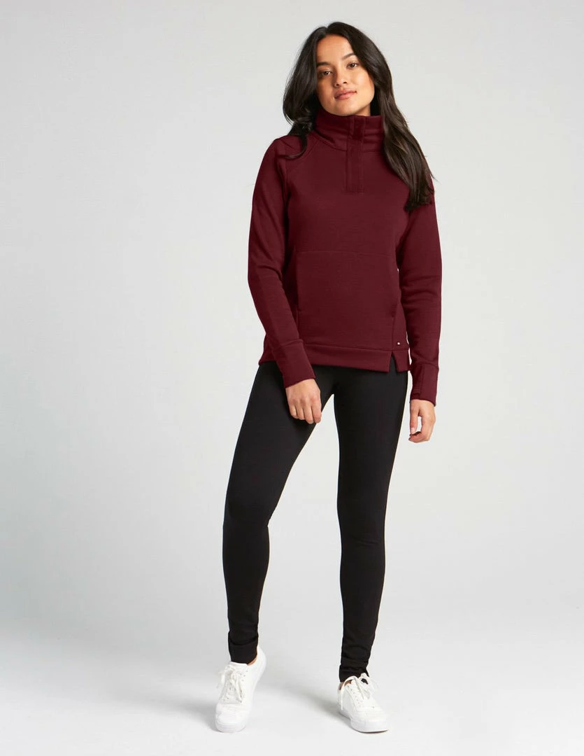 Soft stand-up collar sweater made with Flex fleece, which is made with recycled polyester, created by using post-consumer plastic bottles. Top with front placket with snap buttons, slits at front, back collar adjustment, thumbhole at cuff, shoulder cuts, and hi-low hemline.