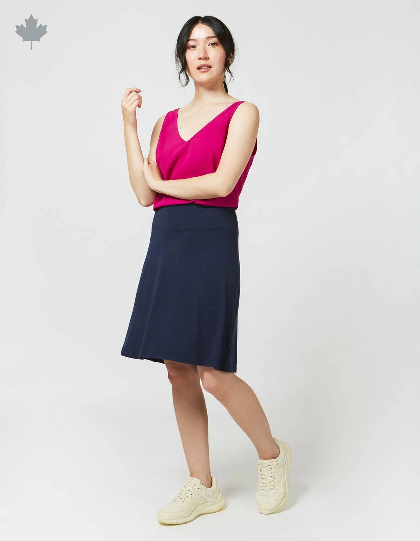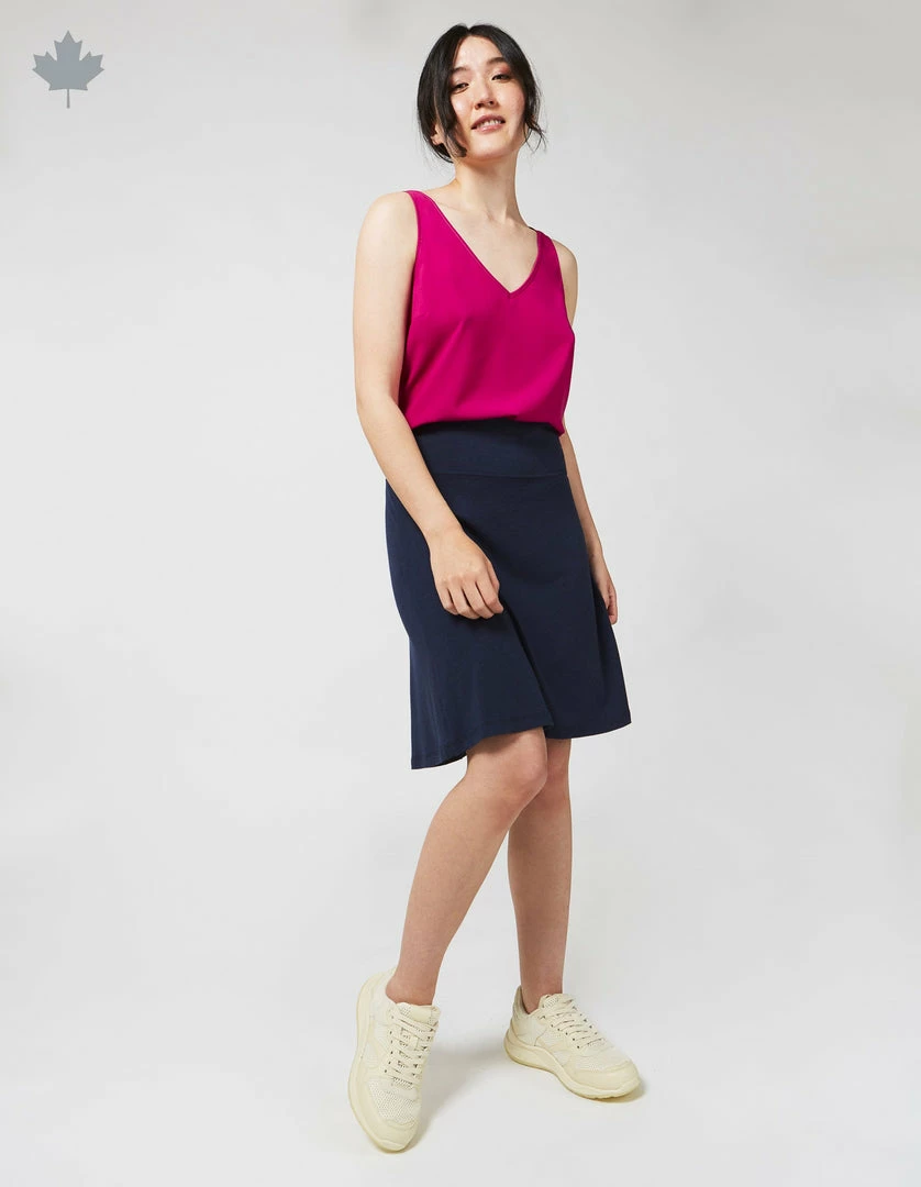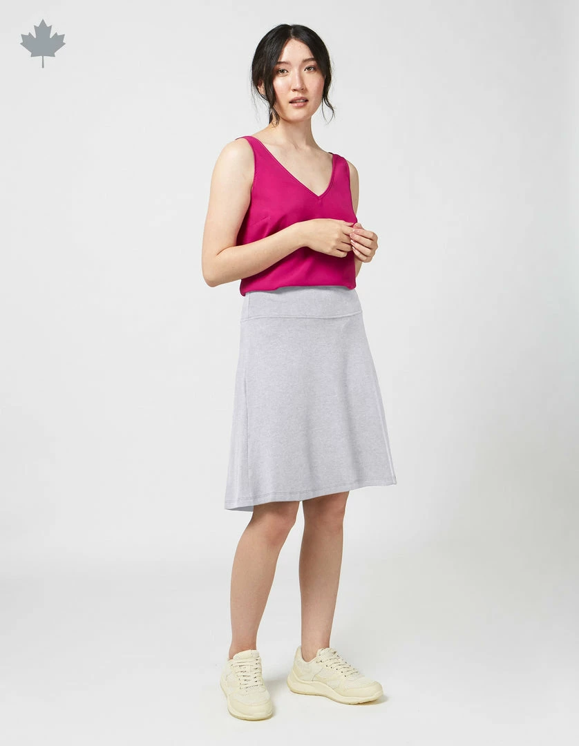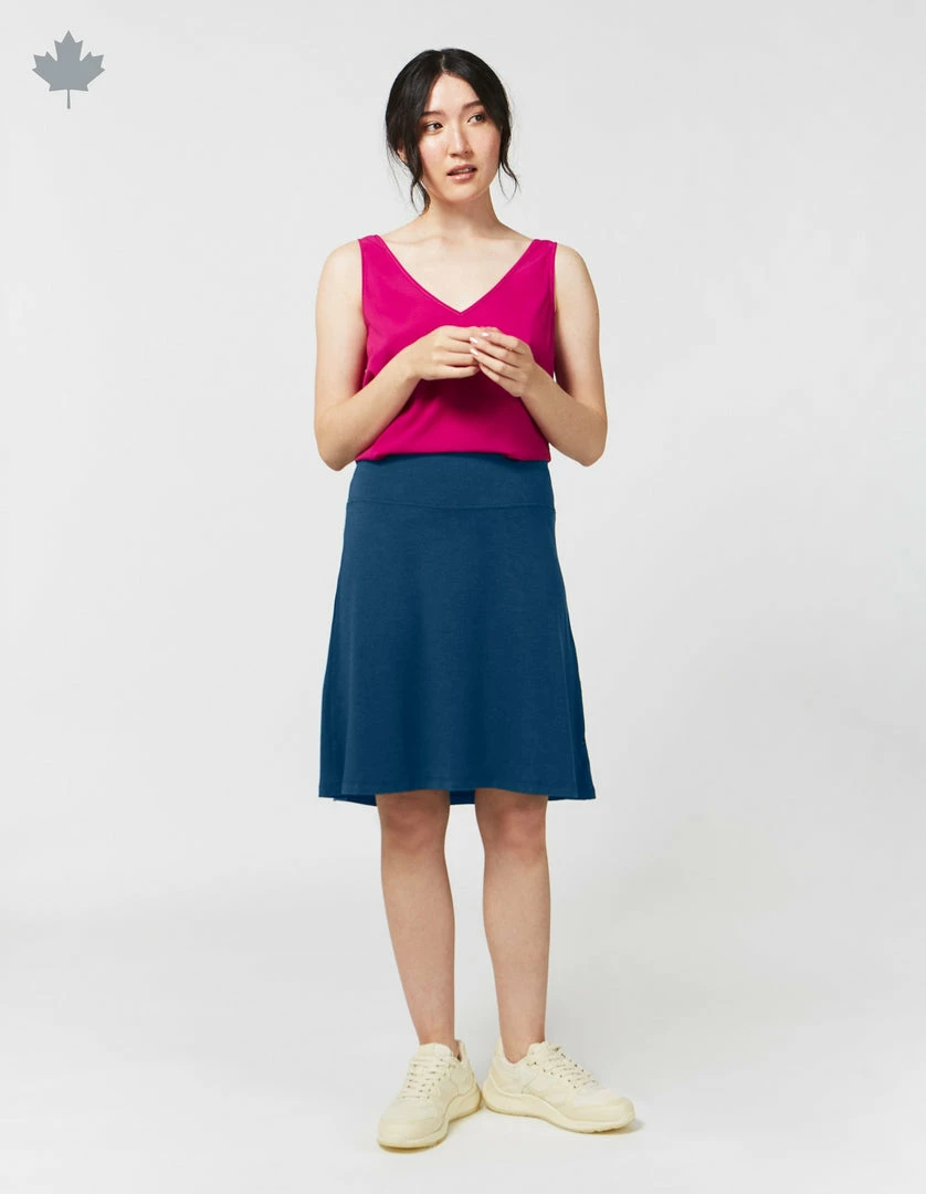 FIG Victoria Skirt. A-line knee length skirt made with organic cotton and TENCEL™ Lyocell, created using an environmentally responsible closed loop process, which transforms wood pulp into fibers. Mid-rise skirt with turn up waistband.