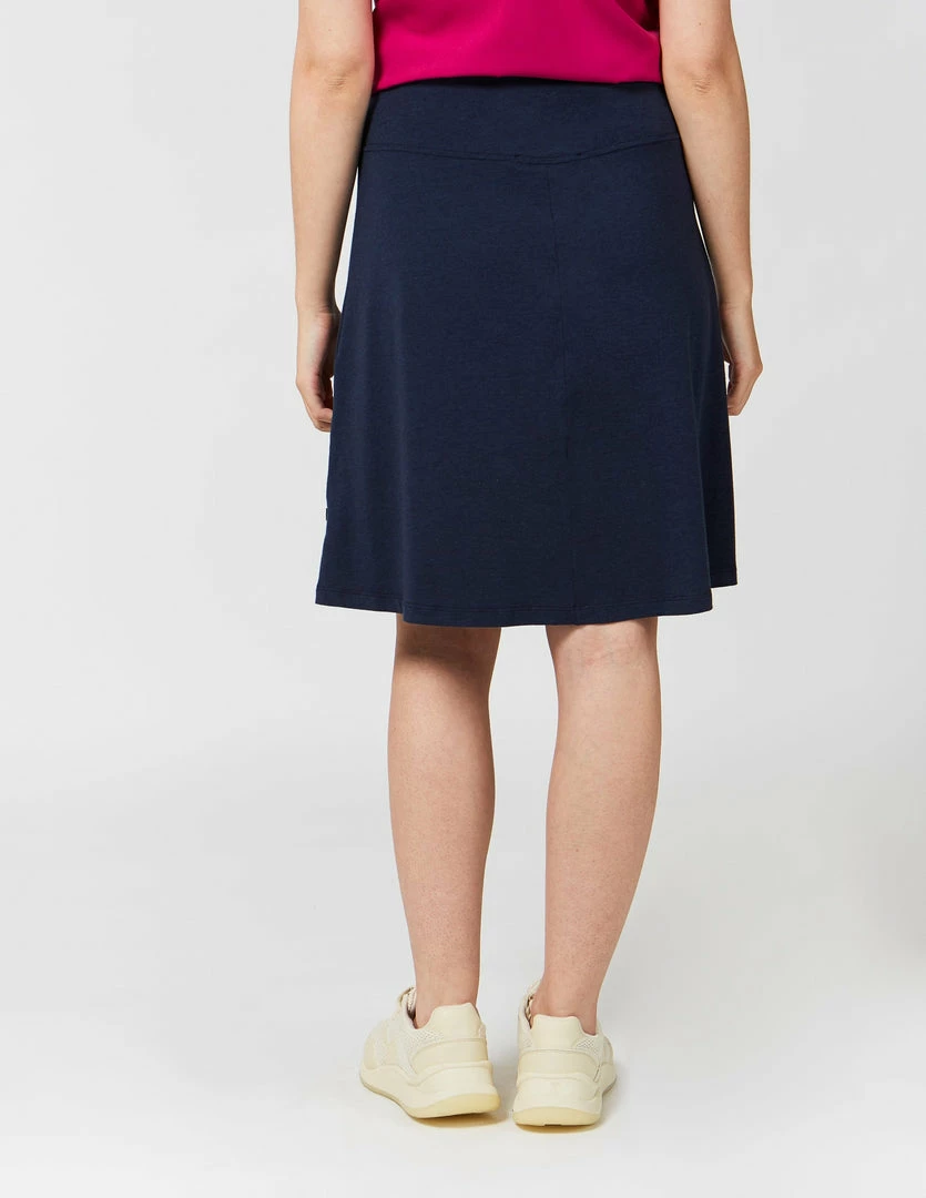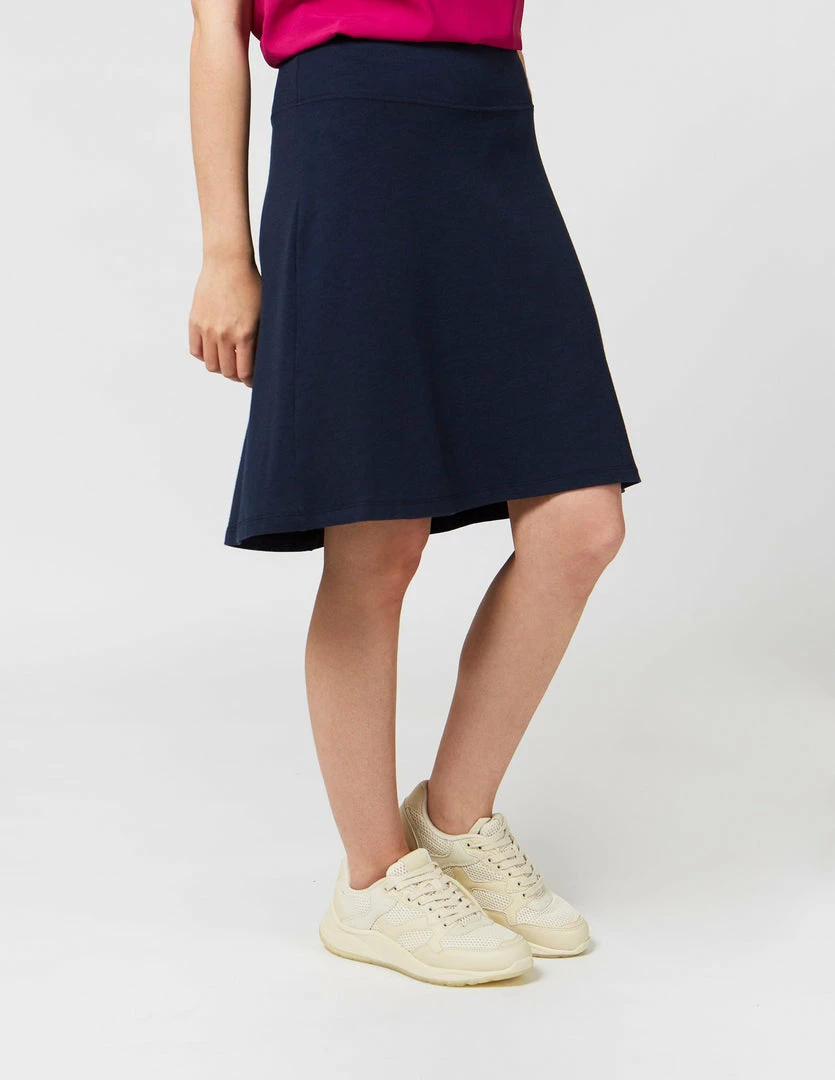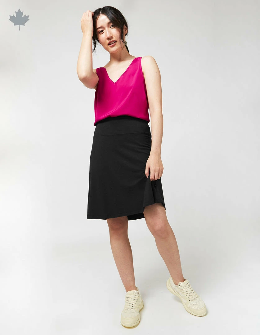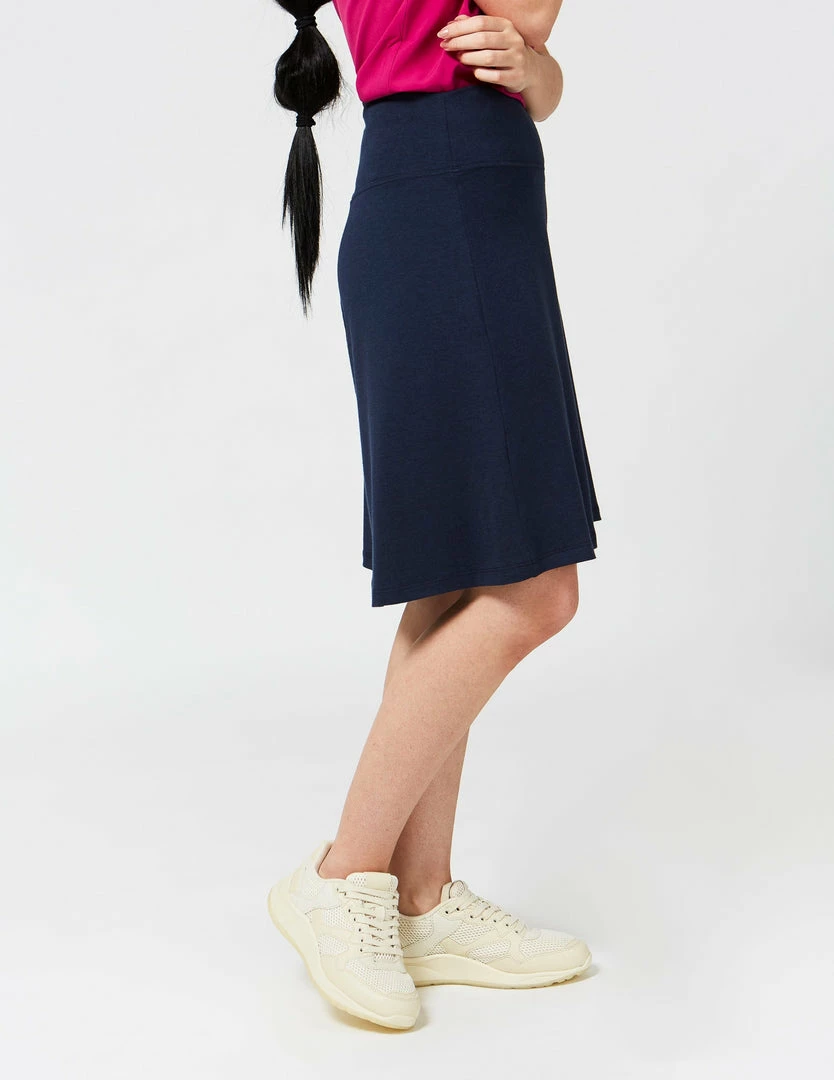 FIG Victoria Skirt. A-line knee length skirt made with organic cotton and TENCEL™ Lyocell, created using an environmentally responsible closed loop process, which transforms wood pulp into fibers. Mid-rise skirt with turn up waistband.
