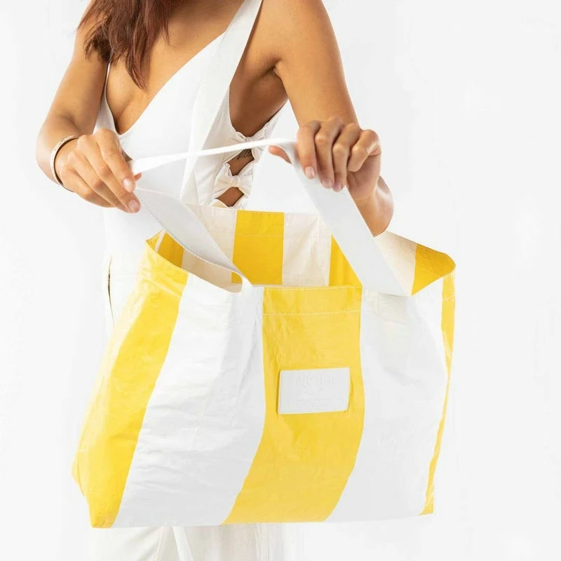 Perfect beach essential to keep all of your belongings zipped up and dry. Expandable full zipper top to maximize space in-flight and on the go. Carry-on approved. Interior zip pocket to keep your wallet, phone, and other travel essentials close at hand for easy organization. Outside zipper pocket to stash your ID and plane ticket. Made out of a special technical material to keep your stuff protected against splashes, spills, and weather while you go from point A to point B. Measures 19″ across the top x 14.5″ tall, expands to 17.5″ tall with a 6″ gusset. Features white straps.