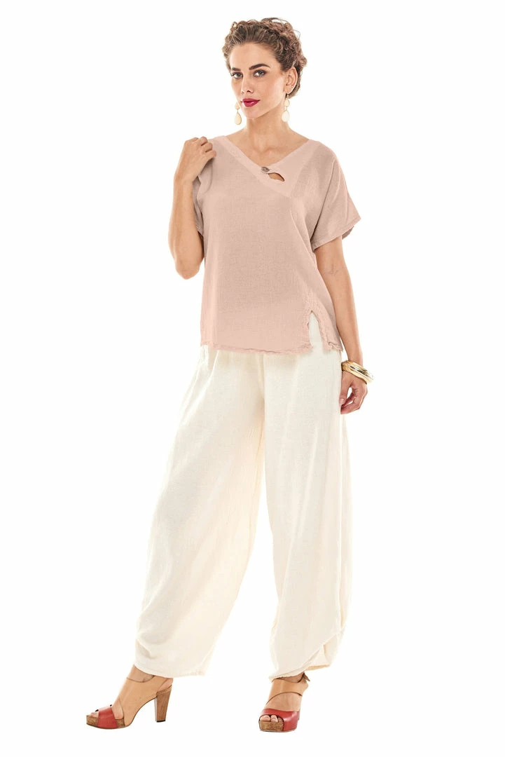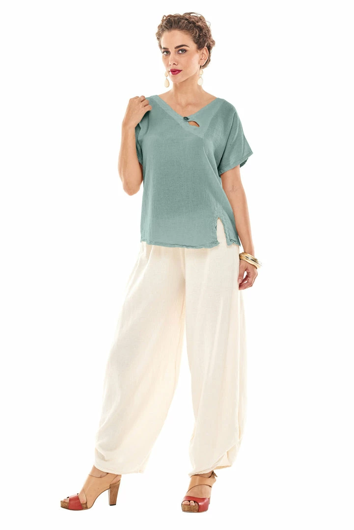 A shorter (petite) length cotton gauze top with a V-neck button and front hem slit detail.