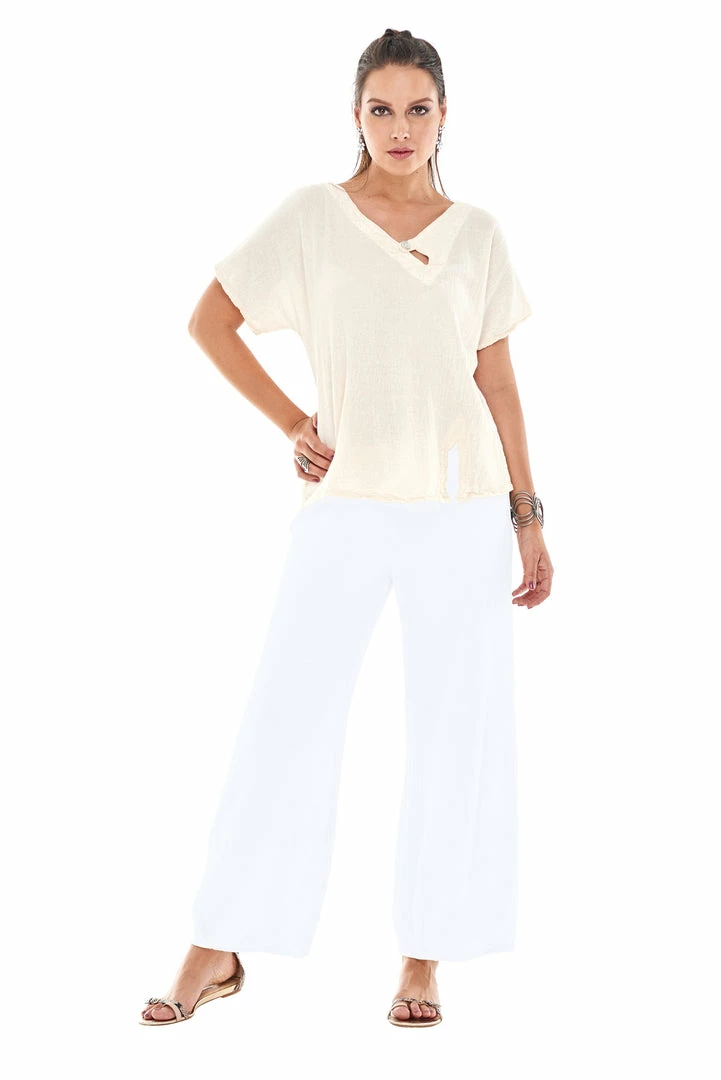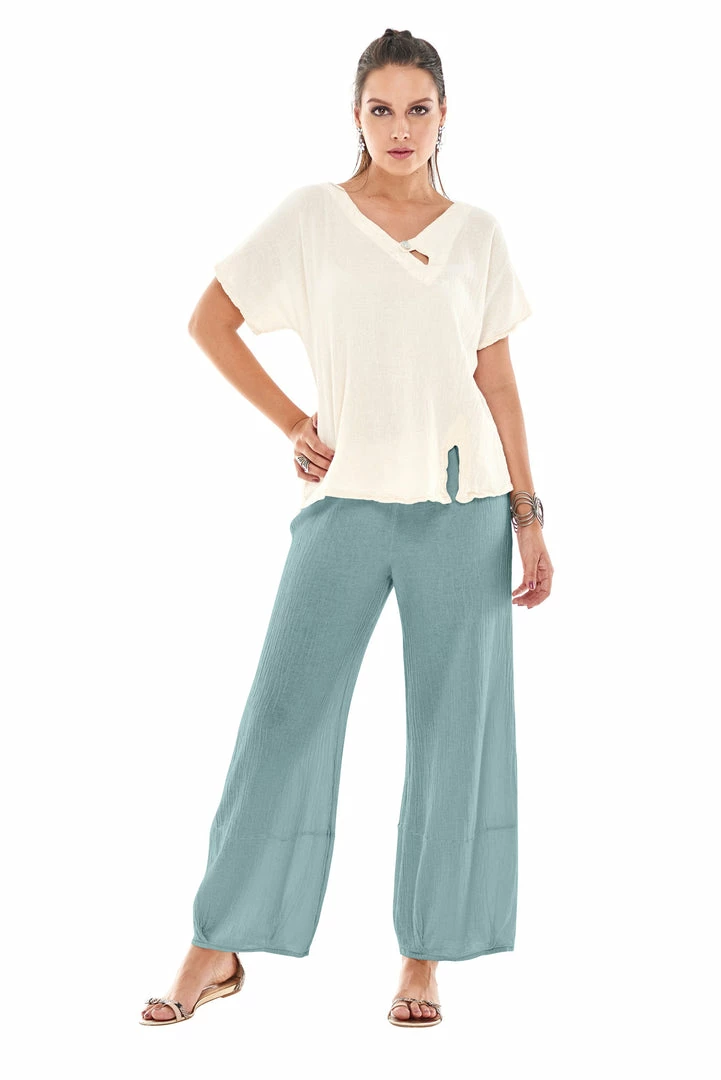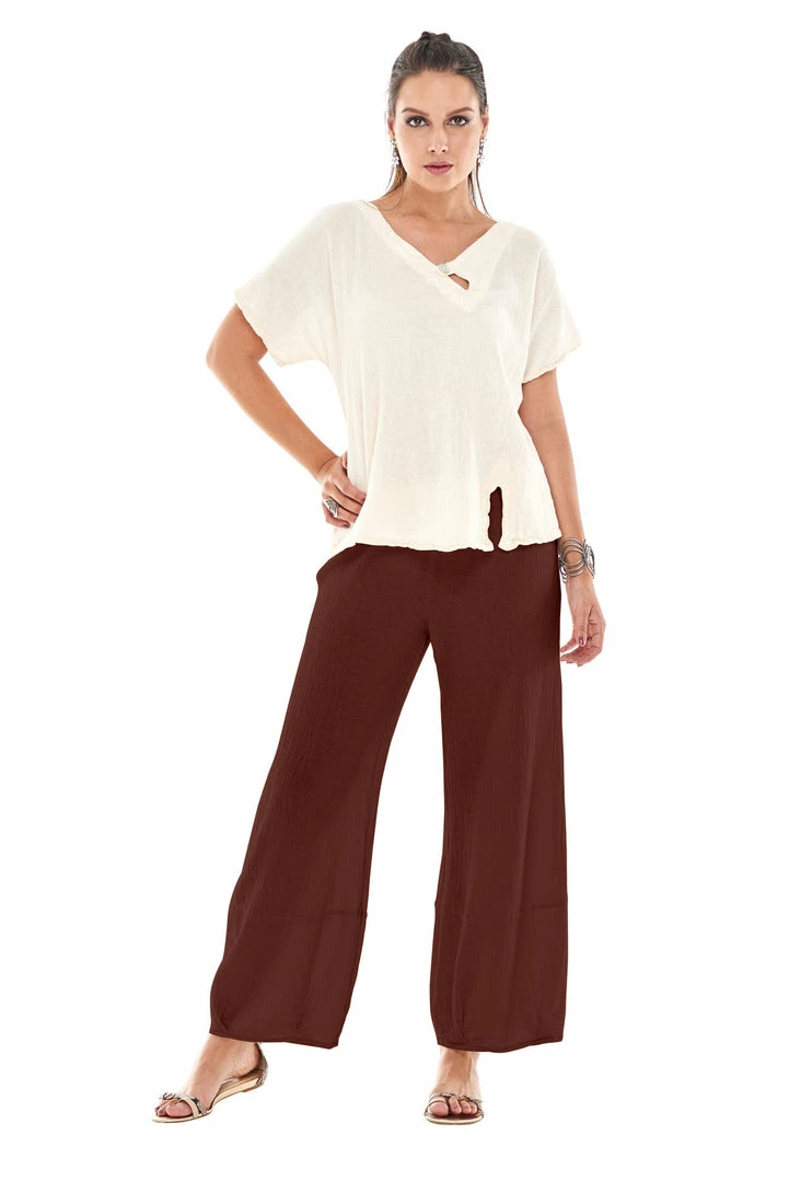 A loose legged cotton gauze pant with a tucked hemline and harem appearance.