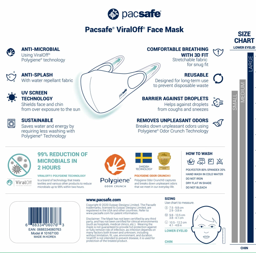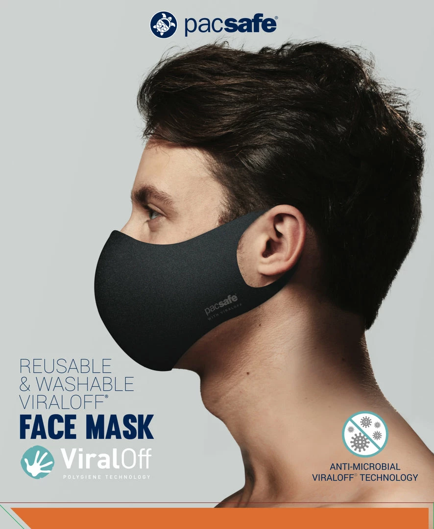 The Pacsafe ViralOff Face Mask treated with PolygieneĀ® ViralOffĀ® will hold 99% fewer viruses in 2 hours. Think of it as sanitizing gel for your mask. Made in Korea. Material: Knitted polyester spandex