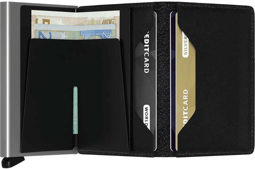 Miniwallet – The perfect all-rounder. Small in size and surprisingly large in storage capacity, the Miniwallet combines the best of both worlds. The exterior holds banknotes, receipts and cards, while the aluminum RFID Blocking Card protector allows you to slide out cards with one simple motion and protects them from bending, breaking and unwanted wireless communication.