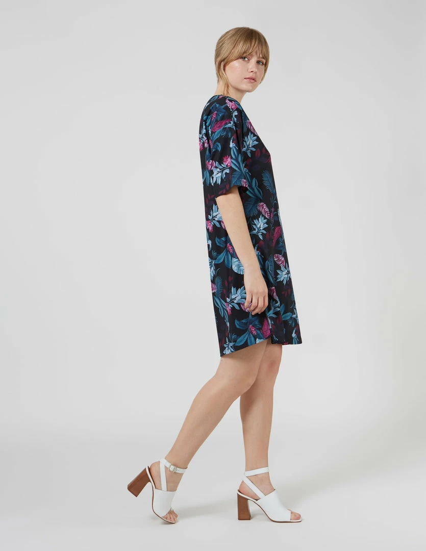Fig Funzi Dress, a boxy dress with V-neck made with Möbius LT, which is made with recycled polyester, created by using post-consumer plastic bottles. Above the knee length dress with spaghetti string detail at front, side-seam pockets, dropped shoulder sleeves, side slits, and asymetrical pleat at back.