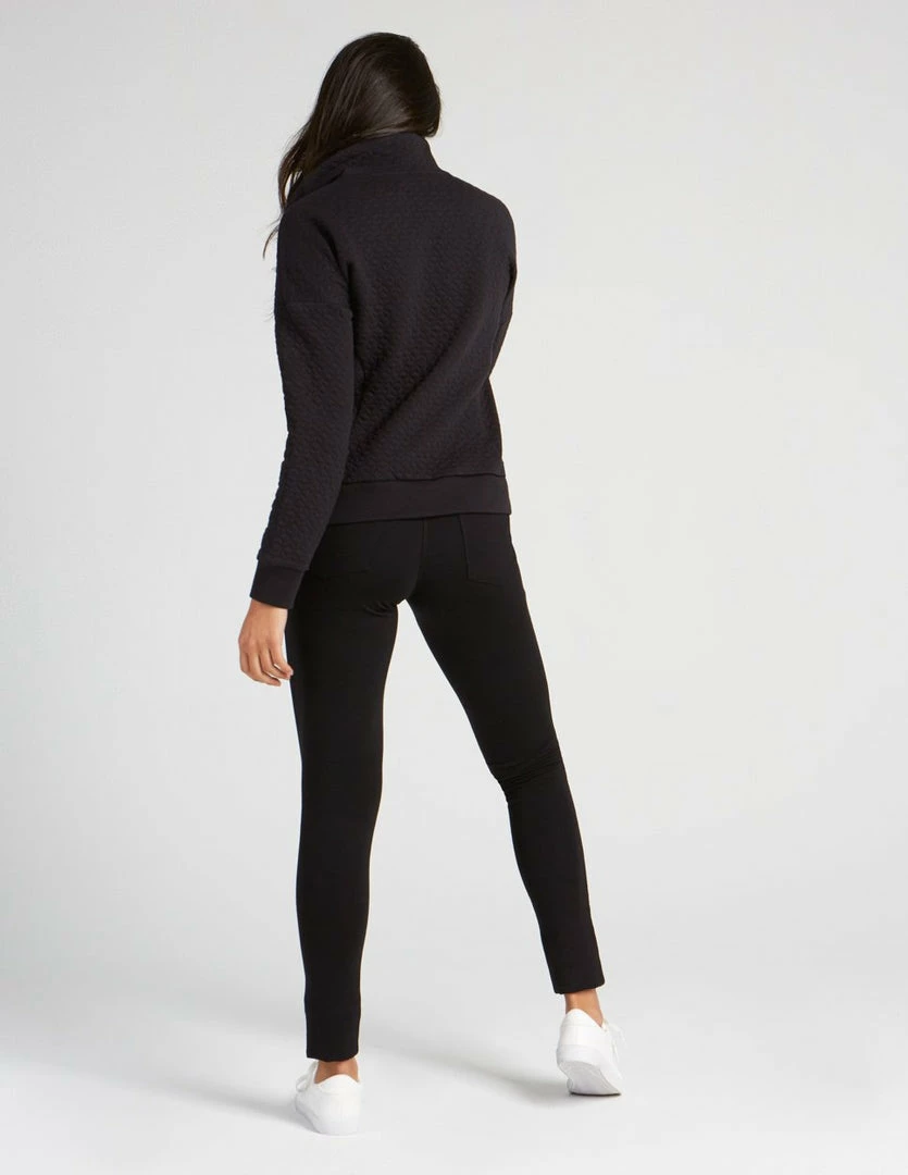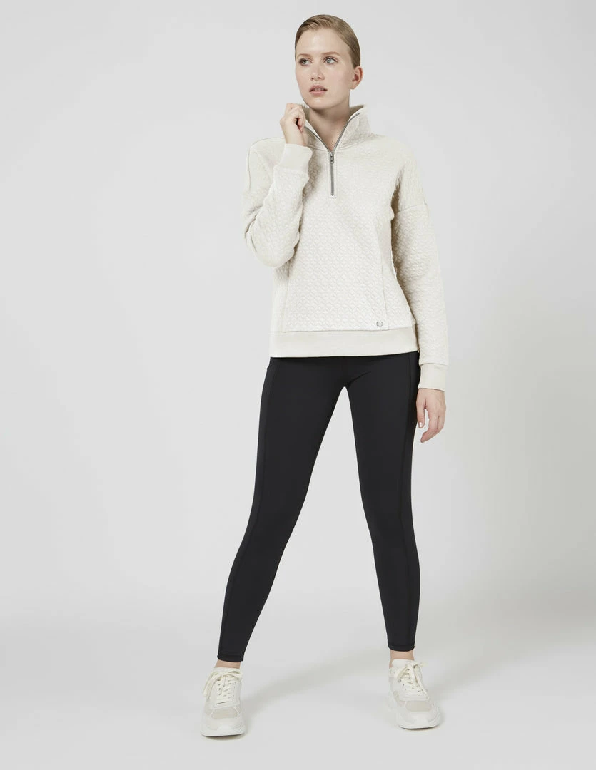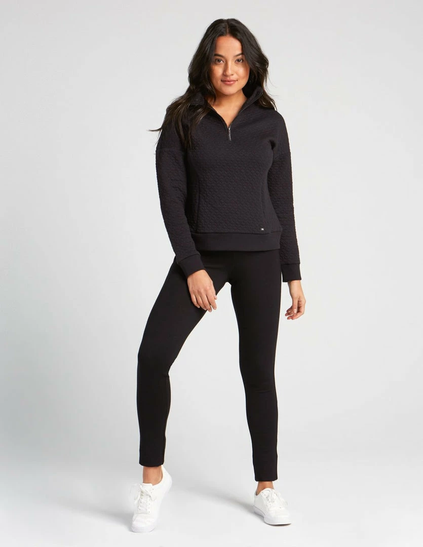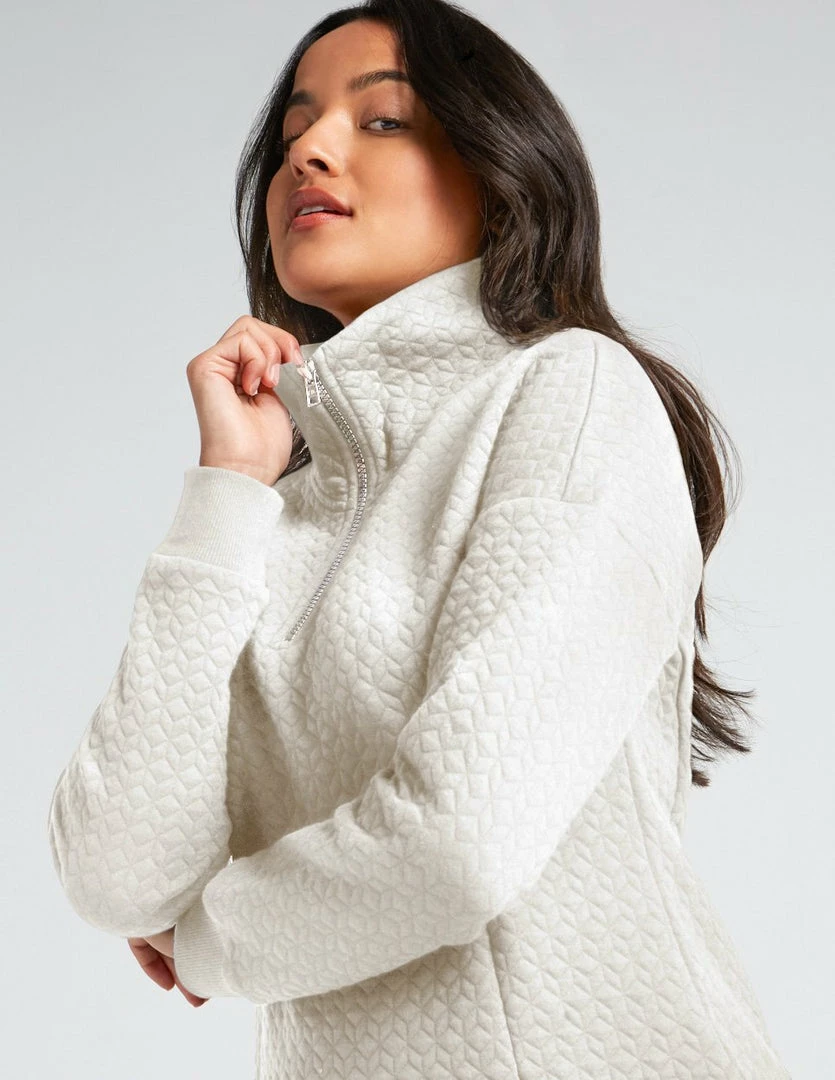 ¼ zip collar stretch sweater made with Air-Quilt, which is made with recycled polyester, created by using post-consumer plastic bottles. Top with VDE mirror like YKK® zipper, rib details at hem, princess seam lines, and drop shoulders.