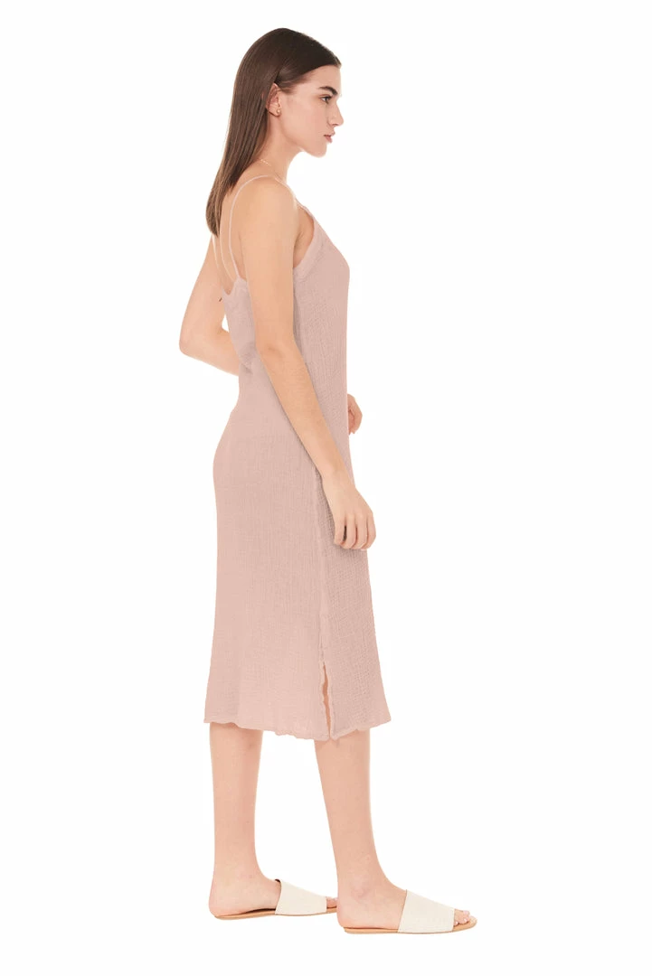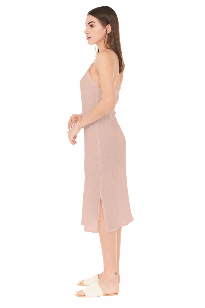 A lightweight cotton gauze slip with spaghetti straps and a side hem slit. Great to wear under sheer material, or as a beach cover-up.